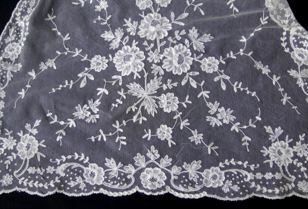 Comments: An interesting handkerchief of muslin appliqued on machine net. The borders of the motifs looked overcast over a heavier thread, like Carrickmacross, but it doesn’t have quite the same design style as that Irish lace. There are some needlerun fillings in the centers of the flowers and leaves. Wish I could see details of the outside edge. A few small holes in the net, not very serious. Overall good condition.