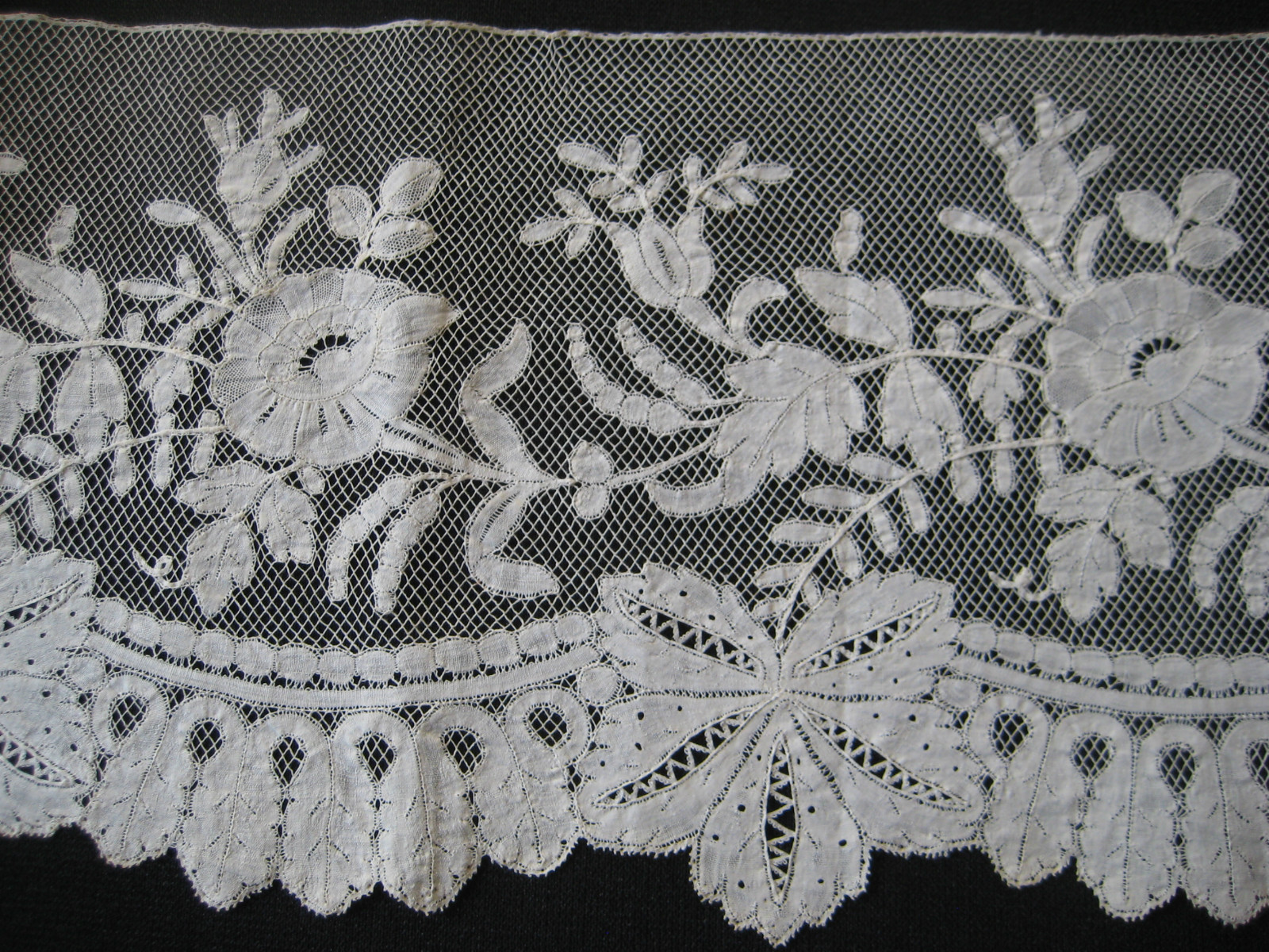Comments: A very high quality Valenciennes de Gand in excellent condition (just one join 1 yard from one end). Very long and relatively wide. Note the half stitch ‘ombre’ contrast in the petals of the flowers. I also like the tiny holes used to decorate the cloth stitch in the 5 lobed leaves at the bottom, haven’t seen that before.