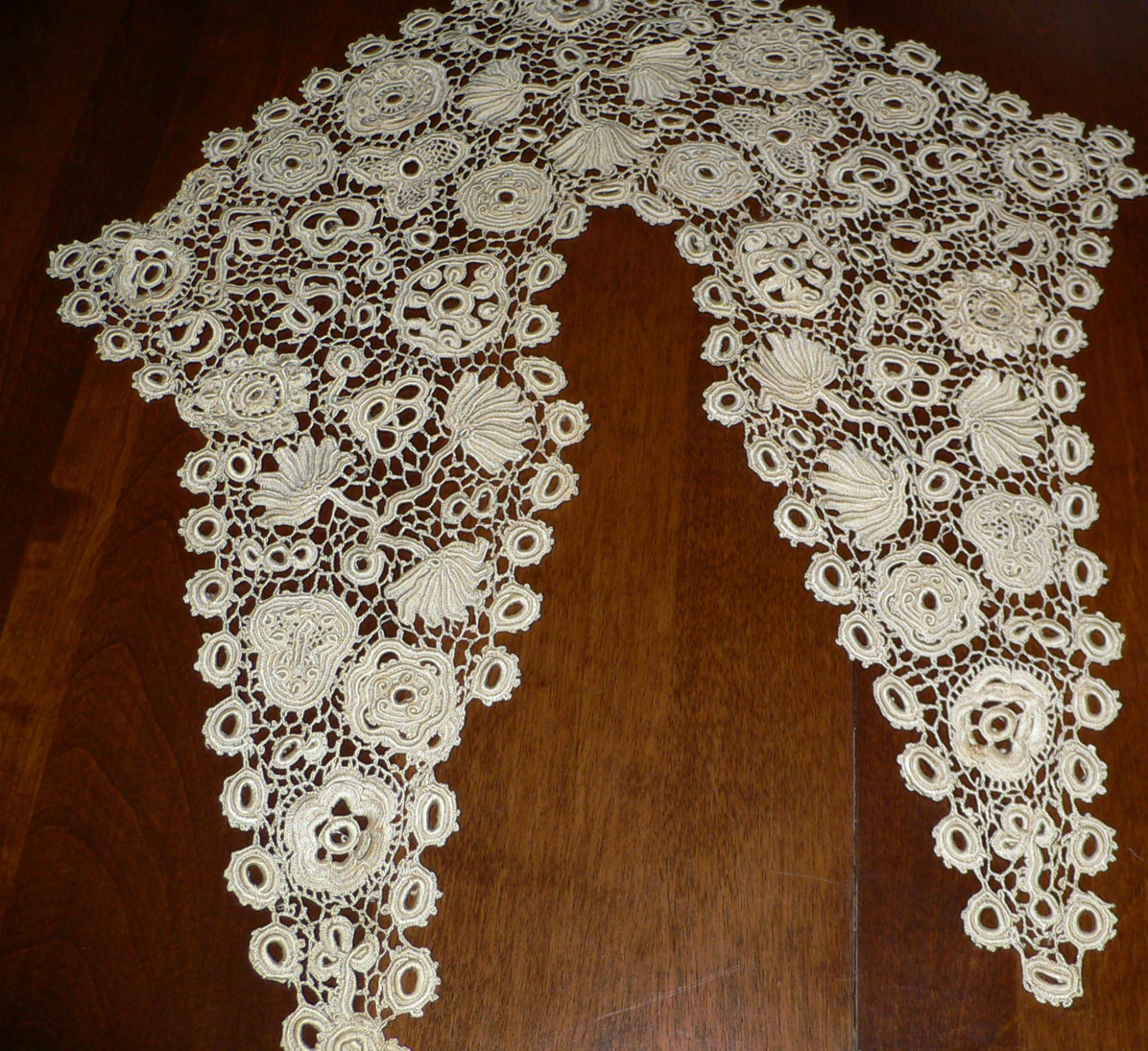Comments: Silk Irish Crochet is relatively rare, and due to the limitations of the thread, often looks a bit different from cotton or linen Irish Crochet. Particularly in the edge treatment, which here is a series of picoted rings. There is also some good raised work on the flowers. Overall condition looks very good, I don’t see anything wrong from the photos except perhaps a little staining on the lower righthand flower. A bit hard to tell exactly without a detailed closeup.