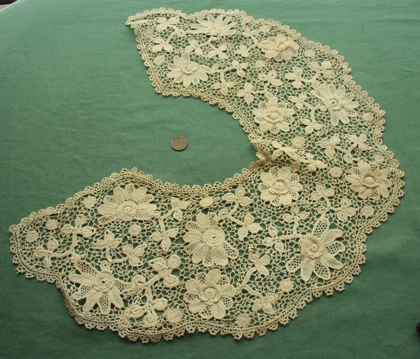 Comments: An Irish Crochet collar, good tight work on the motifs. The picots on the brides are little crocheted loops. Some raised work that’s a bit deformed over time, but that’s probably because they are so tightly worked. Overall very good condition.