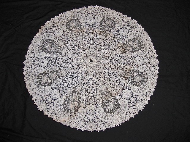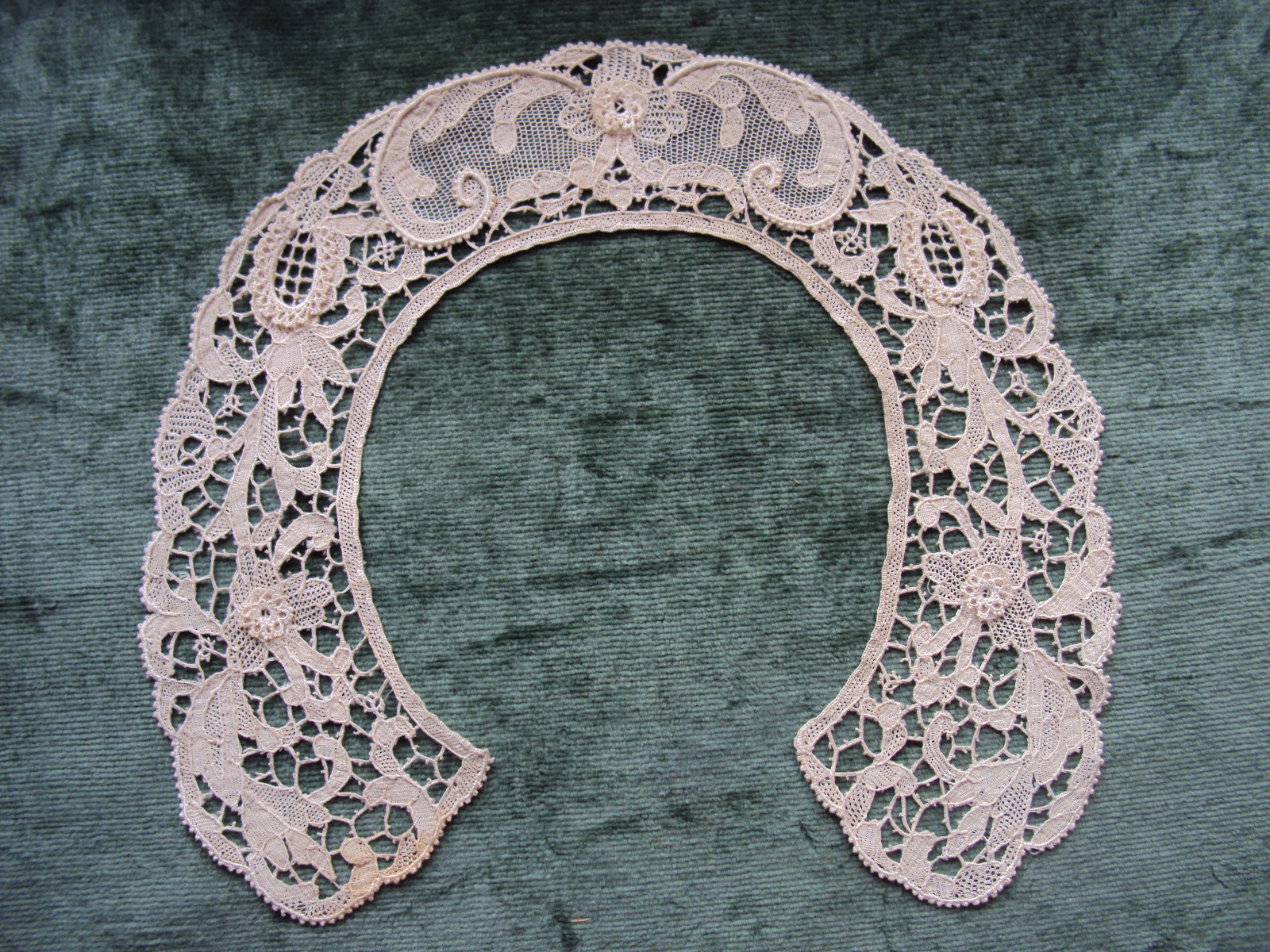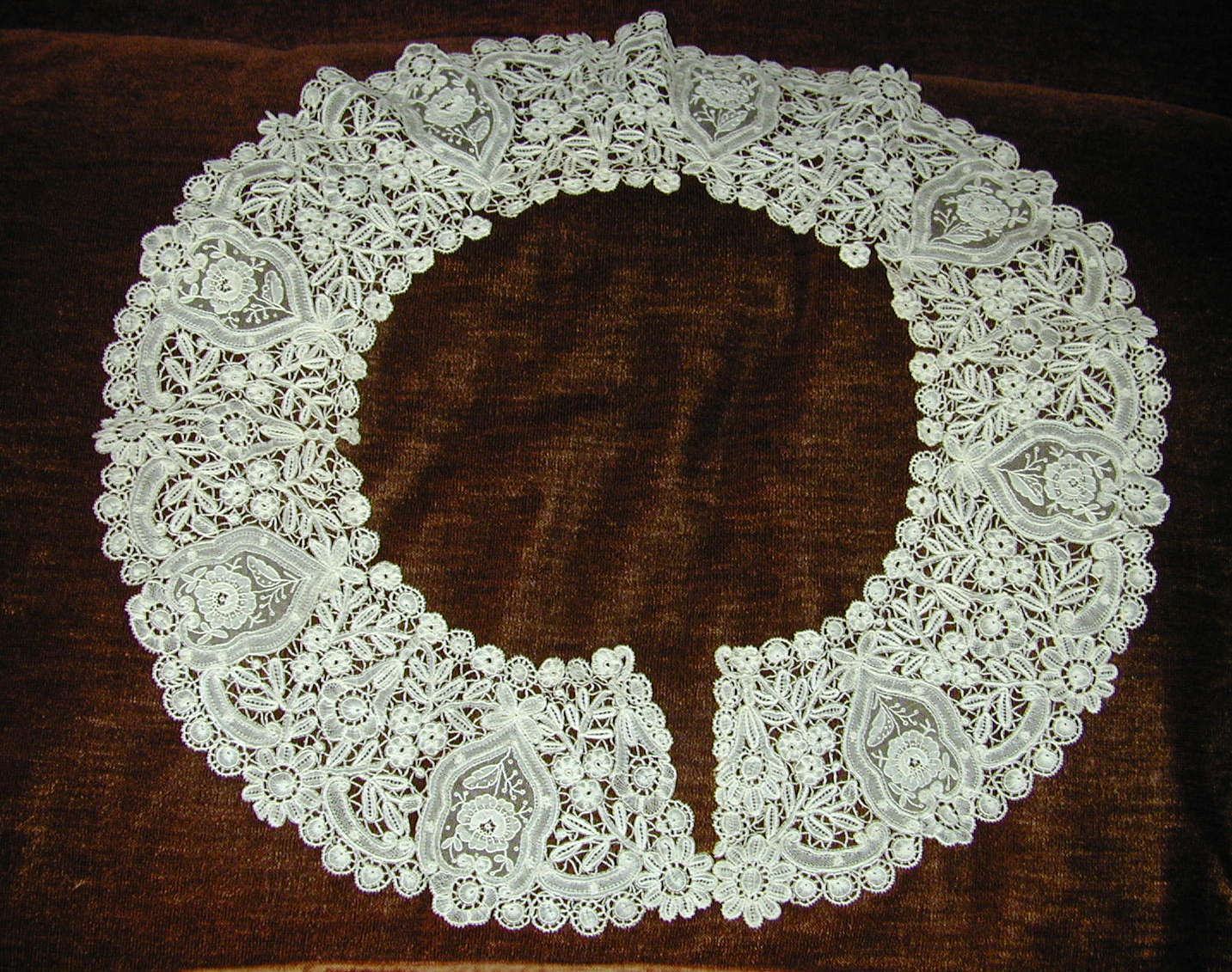 Comments: A small Duchesse de Bruxelles round collar. Raised rose petals in the Point de Gaze inserts. Good typical Duchesse motifs. Some photos are a bit fuzzy, but overall it looks in very good. Seller cites a few broken brides and a pinhole in the net.