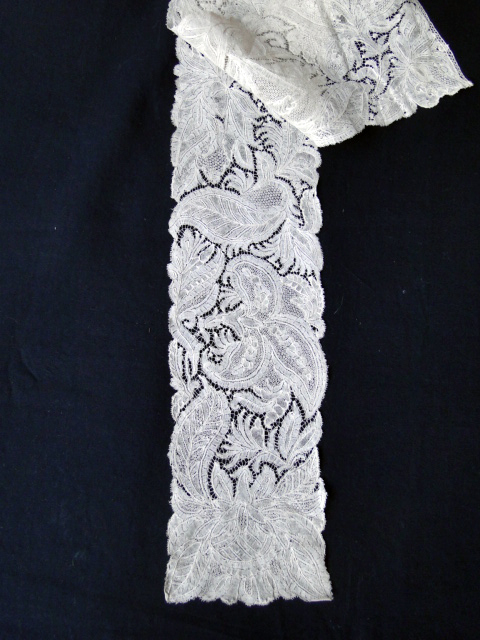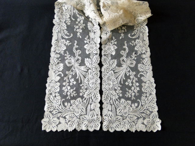 Comments: An outstanding narrow scarf of Valenciennes. Beautifully worked with naturalistic flowers. My only comment is that there seems to be a very small hole above the bow on the right hand side, otherwise condition is excellent.