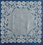 Comments: A Honiton guipure handkerchief. A nice example, mostly snails/slugs era, but the flowers are a bit more advanced. Very good condition, seller notes one small mark on the cloth.