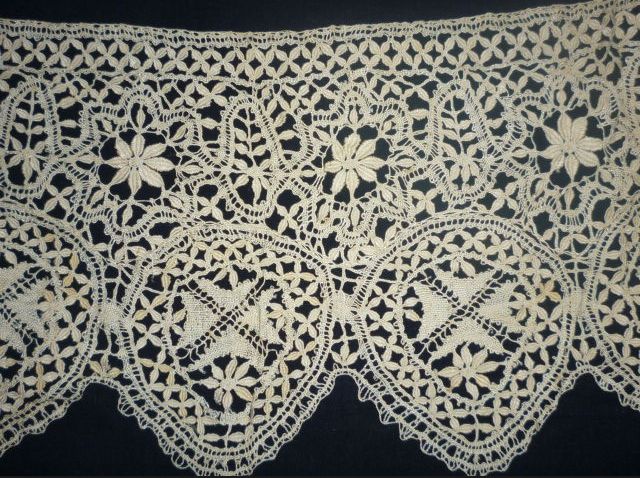 Comments: Wonder where the other lappet is? An outstanding example of Brussels bobbinlace with brides, made 1720-1730. Note the snowflake fillings extensively used in the designs. Telling lace like this apart from contemporary English Devon work can be difficult, and the ‘square’ mass of leaves at the end of the piece is something you also find in English work. But there really aren’t enough known examples to really tell. Based on the fineness of the work, I’ll go with Flemish. The condition appears very good, I don’t see any problems from the photos.