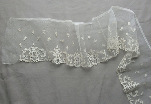 Comments: A border of Brussels bobbinlace application on machine net, with some needlelace fillings in a knotted grid pattern. The piece is light and delicate, with small buds used as esprits in the ground. Note how one end is undecorated, and interesting technical point. Overall condition looks very good from the photos.