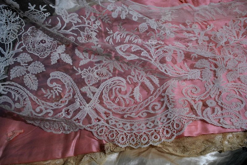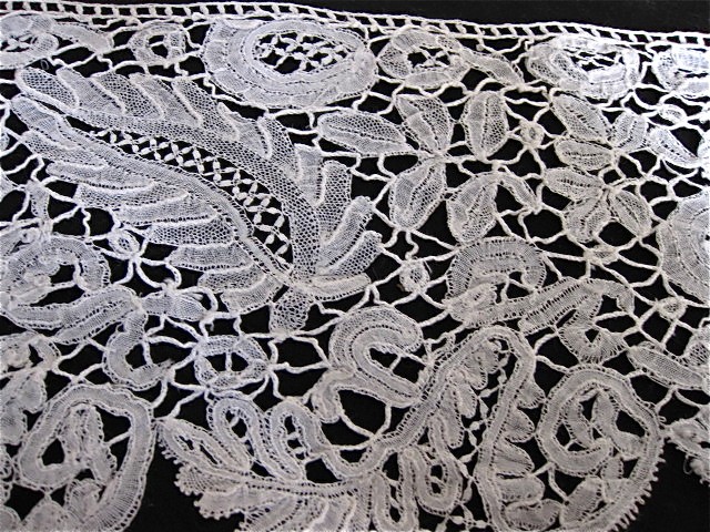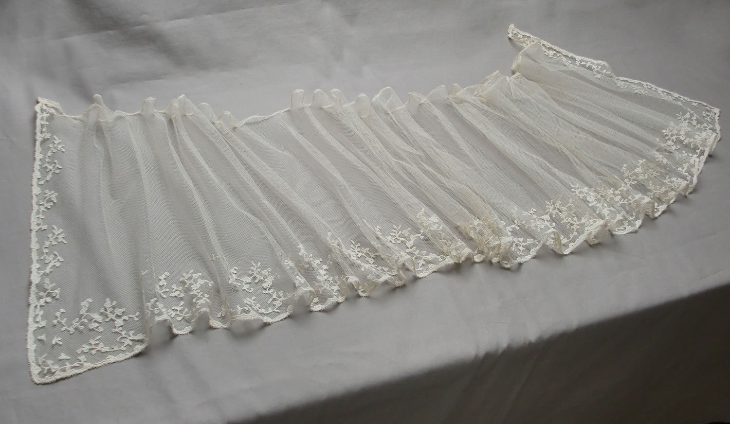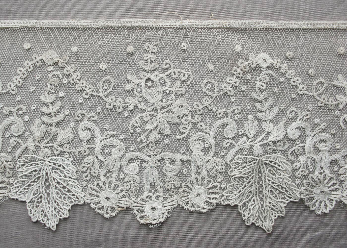 Comments: A wide flounce of Brussels bobbinlace application on machine net. Some simple needlelace fillings, and I think there’s some needlelace Point de Gaze-type mesh used as shading in the roses. Hard to tell, closeups not close enough. The flowers are quite naturalistic. No esprits in the upper ground. Wish there were more of this, and also wish it was photographed flat so you can see the entire design at once. A few small holes, overall good condition.