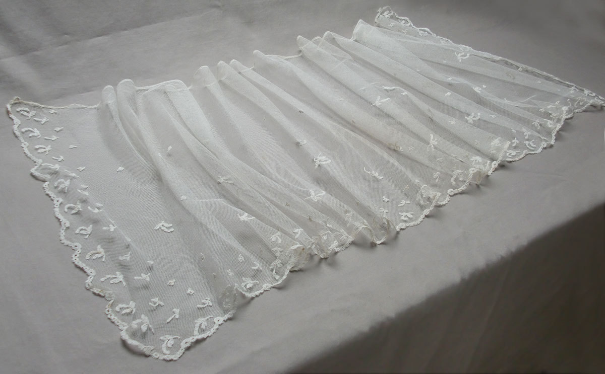Comments: A narrow rectangular veil, perhaps a bonnet veil, although it is a bit long. The lace is muslin applique on machine tulle. The applique appears to be done with an overcast stitch over a heavy cord, not tambour as in Belgian examples. The design is confined to three sides and is quite delicate. Seller cites a few pinholes in the net, overall condition is good.