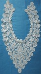 Comments: A Honiton dress front that looks in very good condition n- just a little separation along the neck edge. Snails/slugs, the design depends heavily on the central flower – honeysuckle. The form of this piece is a bit unusual with the ends extending around the back of the neck.