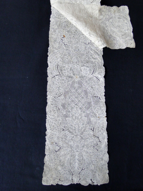Comments: A single lappet of Brussels bobbinlace with brides, and for me it doesn’t get any better. All I want to know is where the other one is. The lappet is complete and in outstanding condition, don’t worry about any little marks, they are trivial. This piece is so dense and so beautifully worked that it almost redefines the definition of lace. 1720 to 1730.