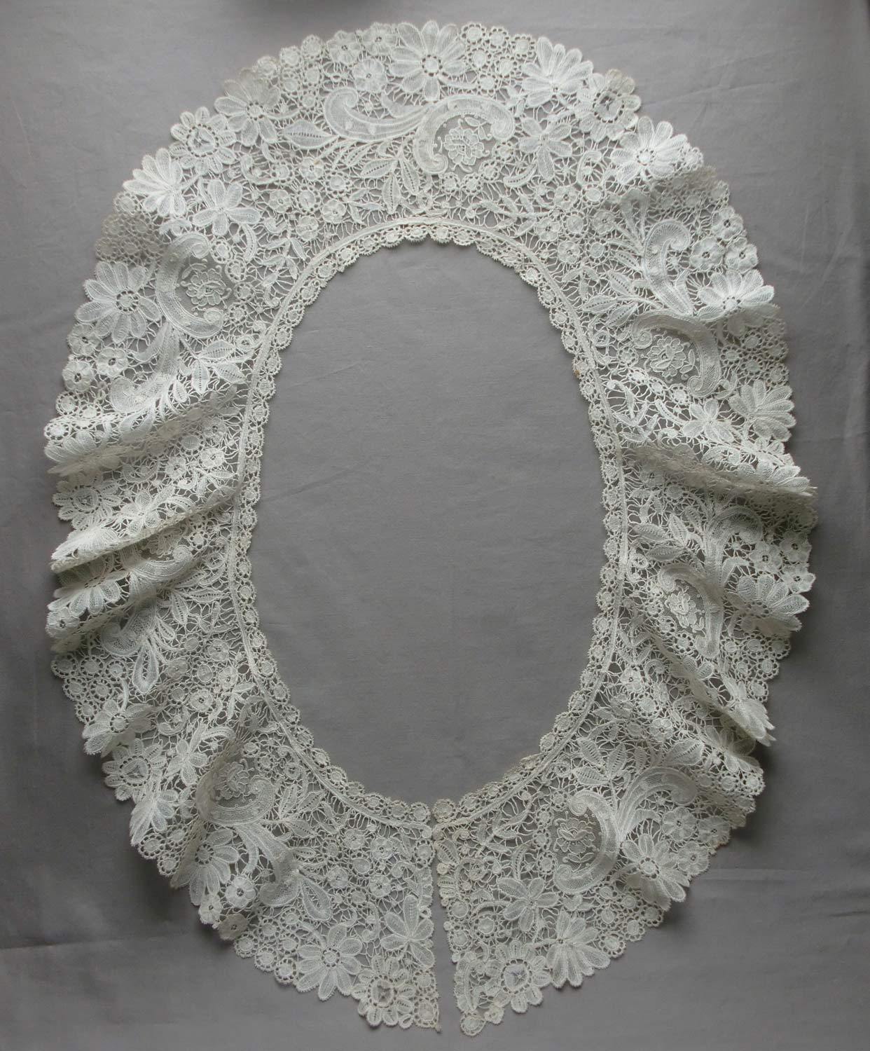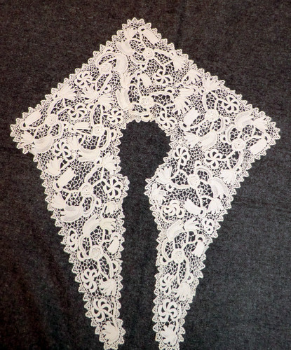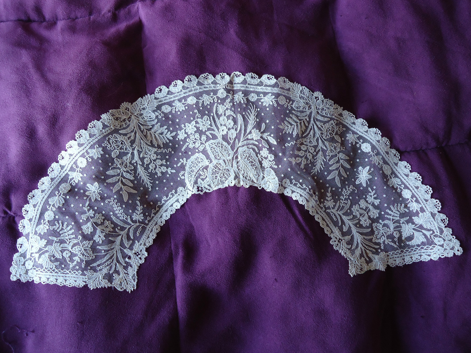 Comments: A Brussels Duchesse bertha collar (“Brussels Duchesse” means a Duchesse bobbinlace with Point de Gaze inserts). Raised rose petals in the Point de Gaze, while the bobbinlace has a bit of a flatter more Bruges style work. But it all comes together very well. Condition is very good, seller notes only 3 tiny orange dots, and I can’t see any sign of damage. Nice piece.