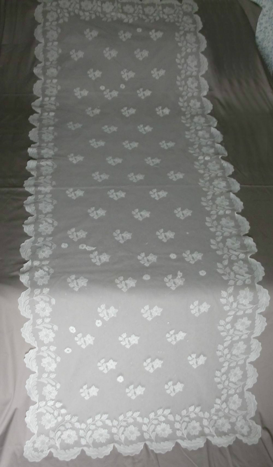 Comments: A large rectangular veil of embroidered net, perhaps Limerick. I don’t know enough about the different styles to assign it to a specific country. The work is nicely crisp and well filled in. It has a simple border of flowers with sprigs throughout the ground. Looks in very good condition, seller cites a few tiny repairs which indicates that this was a valued piece. Machine net is not easy to repair.