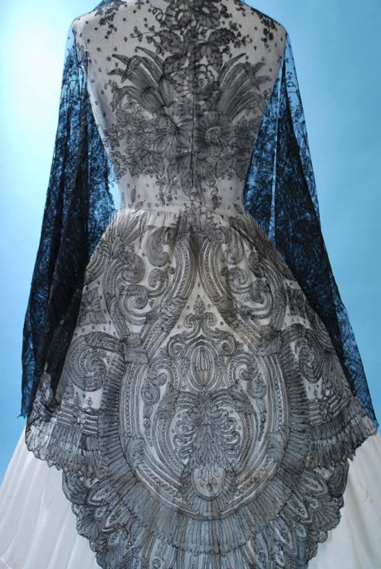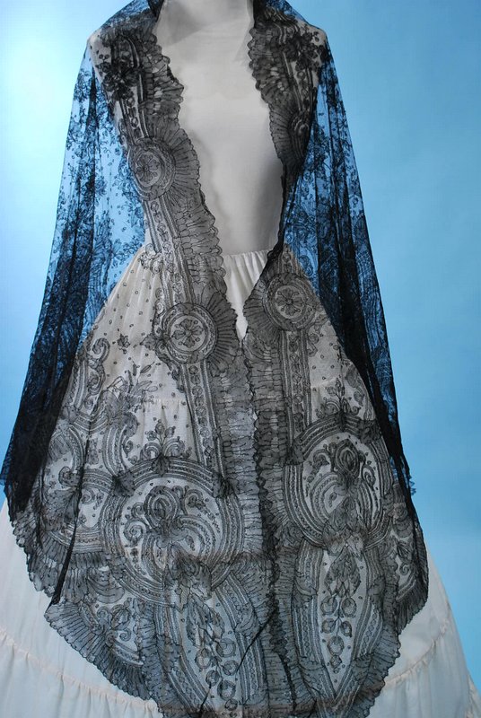 Comments: A large triangular Chantilly shawl. The form is meant to drape over a large crinoline skirt. We see so many machine-made ones on Ebay that it’s a real pleasure to see a handmade one in original condition. I do wish there were some detailed closeups so one could see the stitches, and also where the Racroc lines are. A shawl like this could take a year to make and involve the work of 10-12 women. There is a line down the center back that’s bothering me a little, I wonder if it isn’t a seam on the manikin? It does look in very good condition, seller cites one racroc slit, and I can’t find anything obvious wrong.