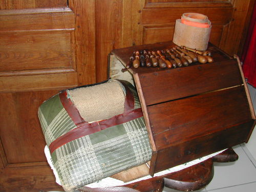 Comments: A French Le Puy pillow – these come up often on French Ebay, but I’ve never seen one with a case before. And it is in very good condition, normally they come to the market heavily used. There are also 16 bobbins and 4 patterns. The whole set appears to be in very good condition.