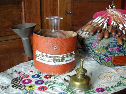 Comments: A French lacemaker’s lamp setup, with a brass oil lamp (chavillou in French), a round focusing glass, a bobbinlace pattern case for the glass decorated with medals, and a funnel for filling the glass. Two others of these sets have come up in the past year on Ebay, by the same seller. If it wasn’t for his efforts, we wouldn’t see any of this material. Overall condition appears very good on all items.