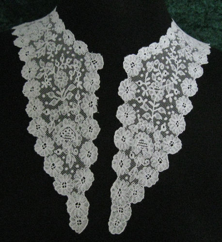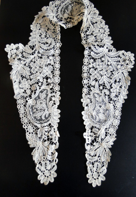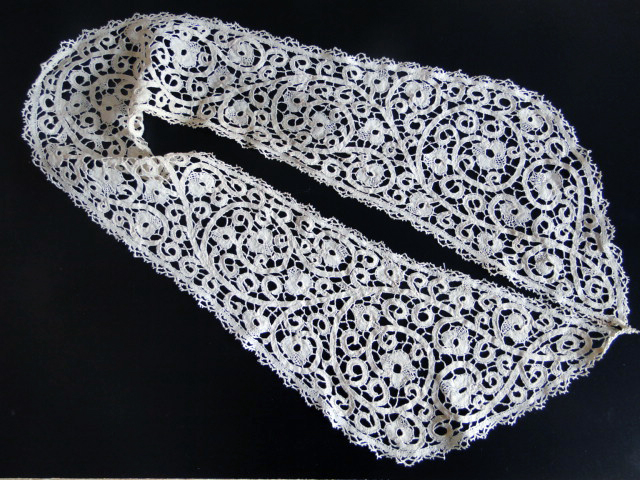 Comments: A Belgian lace deep collar known as Point de Flandre, sometimes called ‘Old Flanders’ by Belgian workers. The brides have some Bruges characteristics with the islands at bride intersections. It is a pieced lace but with many characteristics of very early Flanders lace; a highly decorated tape lace breaking off into individual motifs. This is a nice example in very good condition.
