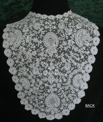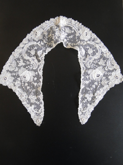 Comments: A Brussels Duchesse collar with long front points. Flat Point de Gaze inserts, and note the little scalloped edges at the bottom of the needlelace- unusual. Overall the design looks a bit crowded and scattered to me. Overall very good condition, seller cites one tiny opening on an edge.
