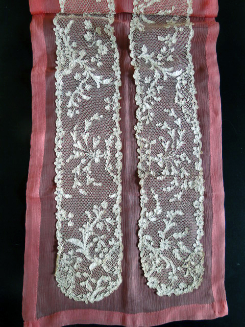 Comments: Brussels bobbinlace with droschel ground lappets, joined at the tops. This is a typical mid 18th c design. Although some might argue an English origin, we don’t have good guidelines to tell the difference at this period. Some of the motifs in the ground might be insects. The picots around the edge are very sharp, I’m wondering if this was added later, not an uncommon 19th c adaptation, and not particularly important for a piece of this quality. Condition is very good with the mesh basically intact except for some minor pulls. One small hole at the end of the right hand lappet. This isn’t the greatest design for lappets of this period, but the condition and quality of work are very good.