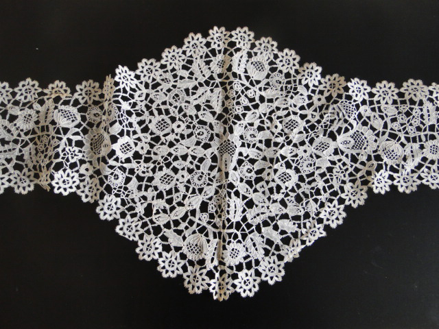 Comments: A Point de Gaze border with raised petal roses. The cordonnet around the motifs is a little scraggly, I’m thinking this might have been washed. Some of the buttonhole stitches on the cordonnet have also come loose in places. But overall things are intact and in very good condition.
