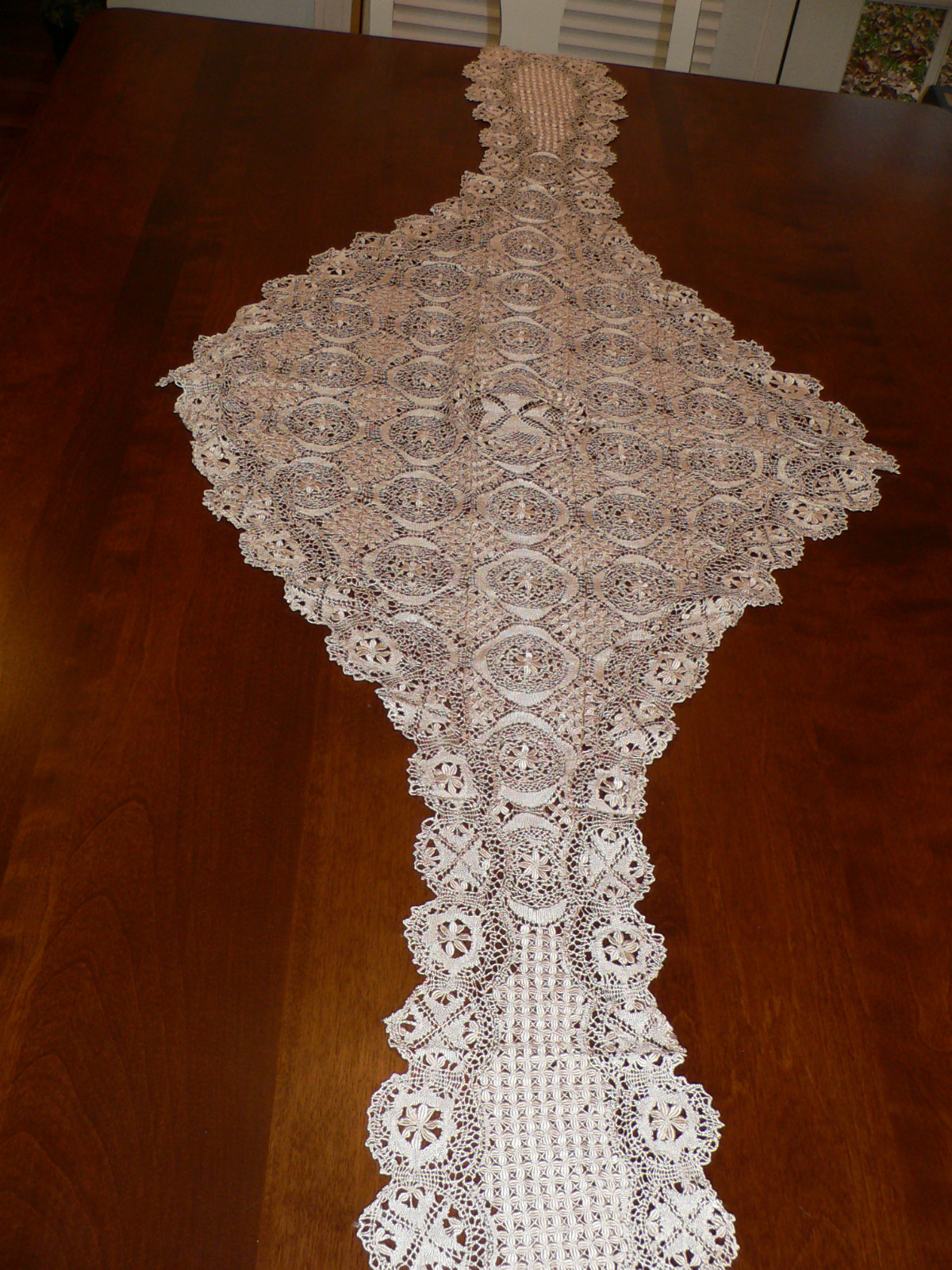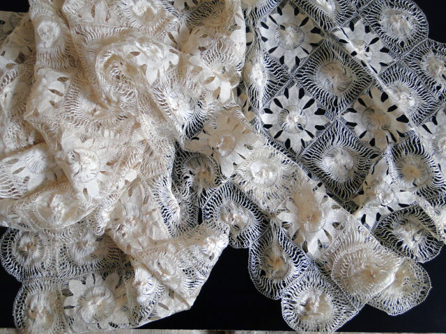 Comments: A Nanduti or teneriffe silk shawl or maybe a runner because it is so long. Silk is rare in this kind of lace, and I don’t really know where it originates. It seems a little off the typical Nanduti patterns. It has two alternating square motifs, tightly woven, with a scalloped motif around the edge. Condition looks very good from the photos.