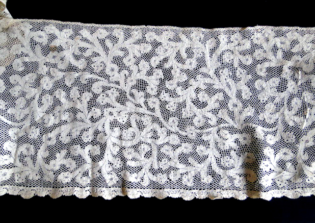 Comments: I think it’s Belgian, sort of an advanced Brussels Duchesse piece. Some of the flowers are needlelace, others bobbinlace with some needlelace fillings. It has a great Art Nouveau feeling. The work is well done, and condition very good, just some minor staining in one spot. One broken stick.