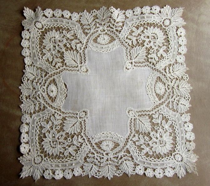 Comments: A Duchesse de Bruges handkerchief. Nice design with carefully worked small motifs. This piece has a good presence. Condition appears very good, a few loose brides and one separation from the center linen, all minor.