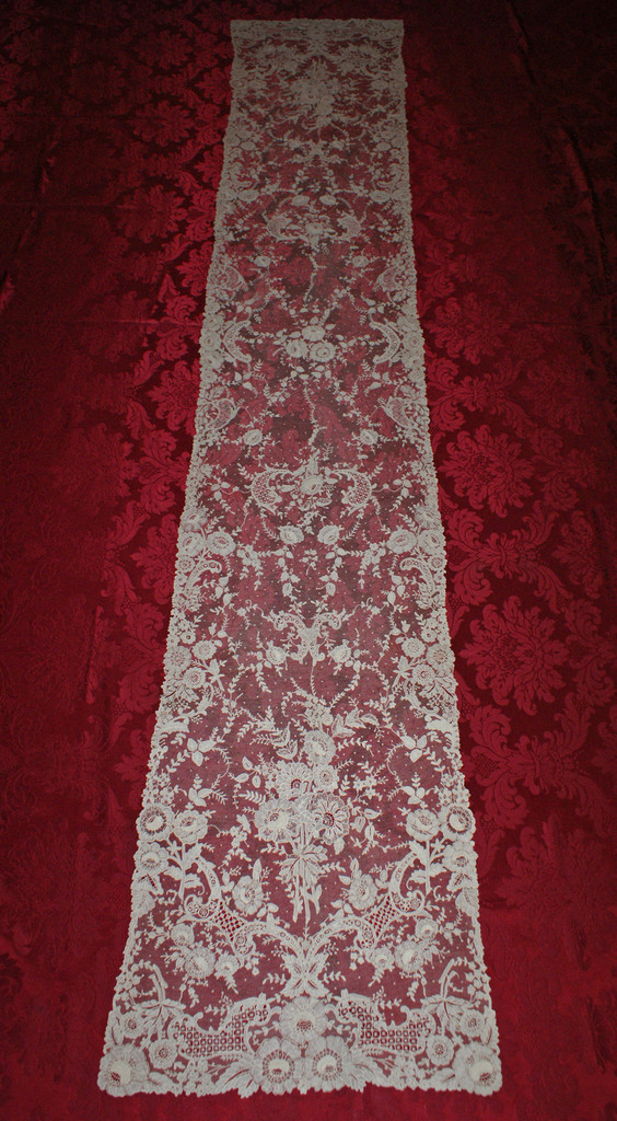 Comments: This is large enough to be a mantilla headpiece. It’s quite an effective Maltese design – the usual alternating Maltese crosses and roundels around the outside, and then there’s a heavy woven leaf grid on the ends, and a regular lattice of roundels and leaves in the headpiece. Seller cites a few loose threads, overall very good condition.