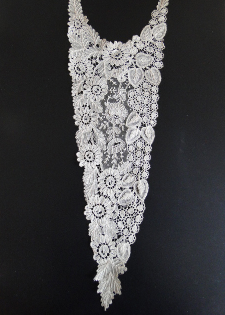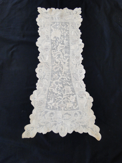 Comments: A Brussels Duchesse triangular dress insert of curiously asymmetric design. The Point de Gaze down the center has raised petal roses. The design is unusual and quite effective, someone put a lot of thought into this. The flowers on the left side are balanced by leaves and buds on the right. I see one broken bride, but overall very good condition, especially in the Point de Gaze.