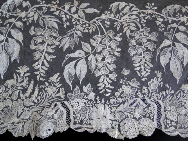 Comments: A wide flounce of Brussels bobbin and needlelace application on machine net. The needlelace is located in the flower fillings, and also forms shading in the petals by using what looks like the Point de Gaze mesh stitch. A good naturalistic design, note the sprays of wheat as a motif. The design fills the entire space, with no esprits. I think this is a later 19th c piece. Seller cites some openings including one 9″ repair. Basically good condition overall.
