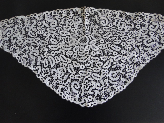 Comments: It might be a little headpiece,m and the piece does look original. Honiton guipure – I don’t know if the brides are bobbin or needle made. Snails/slugs esthetic with varied tally fillings. The design is pretty scattered like maybe someone threw all the leftovers together. But it works. Apart from a few age stains it looks in very good condition from the photos.