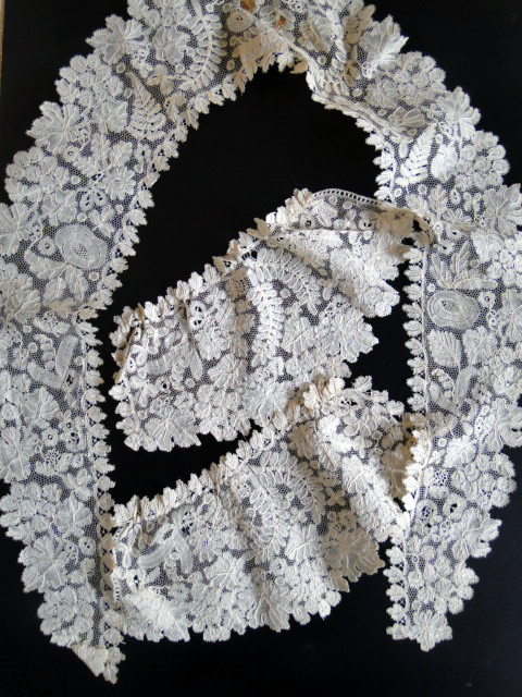 Comments: Matching collar and cuffs of Honiton with a needlelace ground – sometimes called Honiton Point. Good naturalistic motifs, well out of the snail/slugs esthetic. Seller cites two openings in the cuffs and some small ages spots on the collar, basically very good condition.