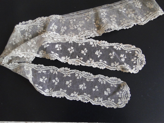 Comments: Mid 18th c lappets with a droschel ground. I’ve got a feeling the description in the post is wrong, so I’ve written the seller about it. These are quite high quality. What you look for in something like this are a good variety of bobbin-made fillings, and small well-defined motifs in an undulating, naturalistic pattern. I especially like the quatrefoil and snowflake variation fillings here. Most pieces surviving from this time have a few pulls in the ground, same here, nothing serious. I’ve got a feeling that the outside picot edge is a later addition – this was often done in the 19th century to ‘liven up’ an earlier lace. An impressive set.