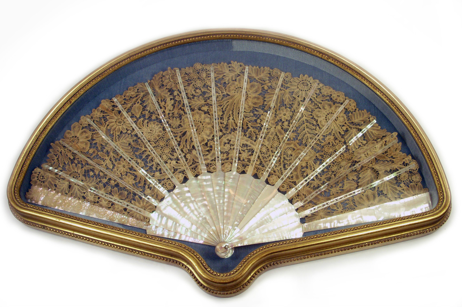 Comments: A Duchesse fan with Mother of Pearl sticks, later 19th century. Nice case, unfortunately the fan is back side facing forward. No Point de Gaze inserts, there might be a little needlelace used as decorative fillings, but photos aren’t close enough to tell. One slip (second stretch of the rib) is broken. The design is dense with some naturalistic flowers, above average in quality. Condition of the lace looks very good.