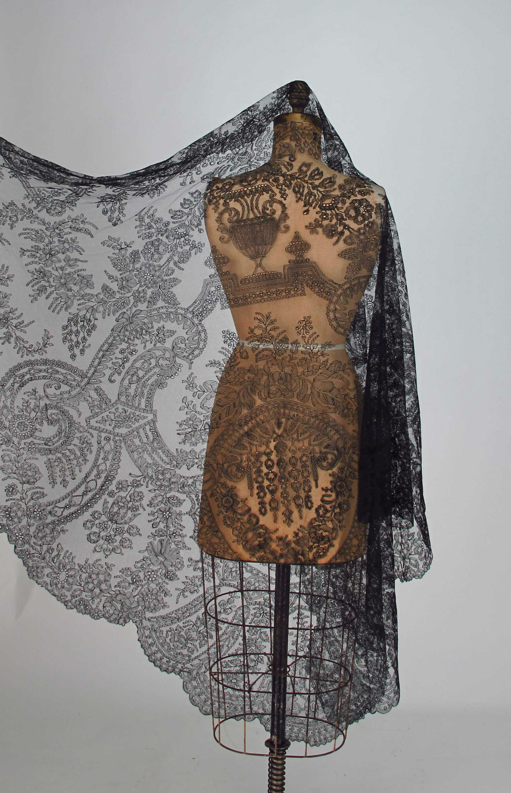 Comments: Handmade Chantilly is so powerful, it hits you in the face with its beauty. Quite a refreshing change from all those Leavers shawls that appear regularly on Ebay – lovely, but not like this. The racroc strips in this triangular shawl seem to run parallel to the long edge which is unusual. Seller says there is one small repair, and I don’t see any obvious problems in the photos. Overall very good condition. 3rd quarter of the 19th c, this form was meant to drape over the back of a large crinoline skirt.