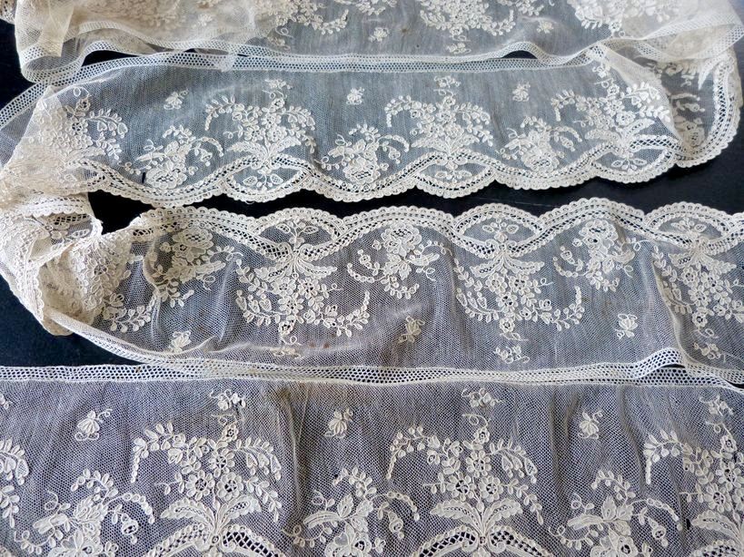 Comments: A lappet set of probably Flemish bobbinlace with droschel ground. English is sometimes a possibility in pieces like this, and you have to look carefully at the design and how the ground is put in. The droschel here is very straight, and although the design is a bit plain, the fillings are great. Mid 18th century, although the picot edge might be a 19th century addition – it looks a bit too crisp. The set does have a lot of rust spotting, but more to the point, two sections appear to have been replaced. The work on these modifications is so good that it seems to be a very early operation in the history of the set.