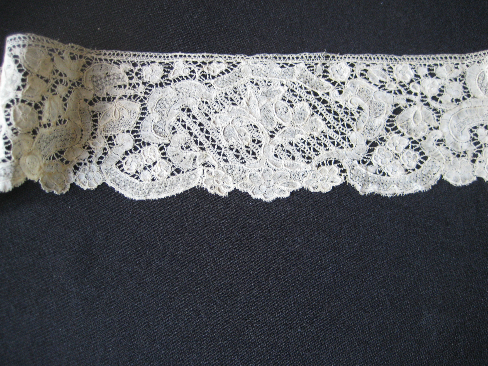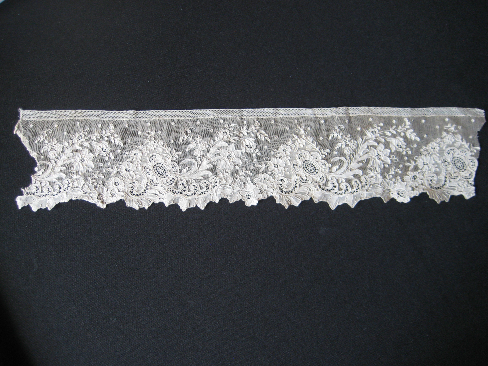Comments: A long border of French Alençon needlelace. Not quite as flamboyant in design as the greatlace piece above, but it looks like the technical work on toilé variations and “mode” fillings is more detailed. I see a little brown spotting in places, and one hole in the last photo – but I’d rate it very good on condition from the rest of the photos.
