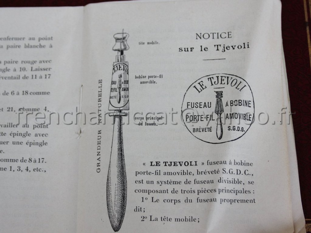 Comments: A child’s bobbinlace set from the ‘la Boule de Neige’ people. Similar, but not exactly the same as the Cottier sets that sometimes come up on Ebay. Note the bobbins – the heads come off and you can replace the cone of thread. I have one of these, beware, if you live in a dry climate the bobbin will warp substantially. The set contains the second edition of La Boule de Neige – undated. Mostly Torchon patterns. The first edition came out in 1905 and the third in 1918. There is a photo of the set in the booklet and it says it has 26 bobbins, unsure if all of them are in the set here. The cover of the box also says something about embroidery, so I’m not entirely sure how the bobbinlace and embroidery fit together.