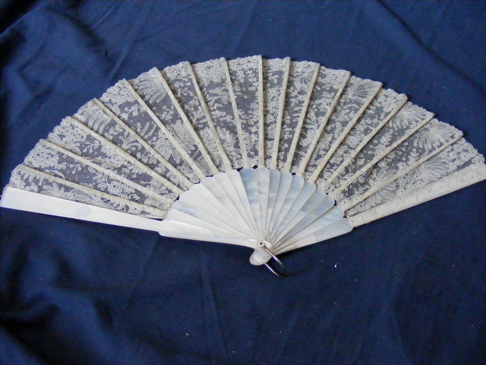 Comments: I’ve been staring a lot at this fan and am as convinced as I’m ever going to be that it is white Chantilly. Mother of Pearl sticks and a slightly worn box. The lace itself looks in very good condition, I don’t see any problems in the photos. The sticks also look in good shape.