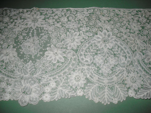 Comments: An small narrow scarf bobbinlace resembling Bruges Bloemwerk. A little raised work on half-stitch ground, and everything has a single thread gimp. Some of the flowers are a bit innovative, so I think it tends more toward the Brussels Duchesse tradition. Looks in very good condition from the photos, just a broken bride or two.