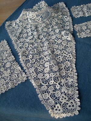 Comments: A matching set of Irish crochet – dress front, 2 cuffs, an insert with attached choker collar. Rare to find them all together. Raised rings in the centers of the motifs, which are tightly done and geometrically arranged. Picots look like chained loops. The condition of everything appears very good, although I’m a bit nervous about the ‘freshly laundered and snowy white’ statement.