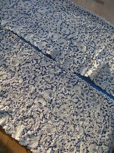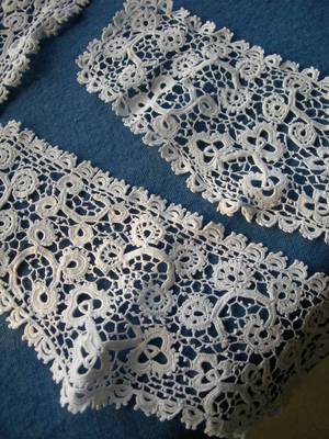 Comments: A good length of Brussels Duchesse. Photos aren’t detailed enough to tell if the roses have raised petals in the Point de Gaze inserts, but I think they look rather flat. Not sure. Some nice raised work in the densely patterned bobbinlace. Seller cites a few stains, overall very good condition.