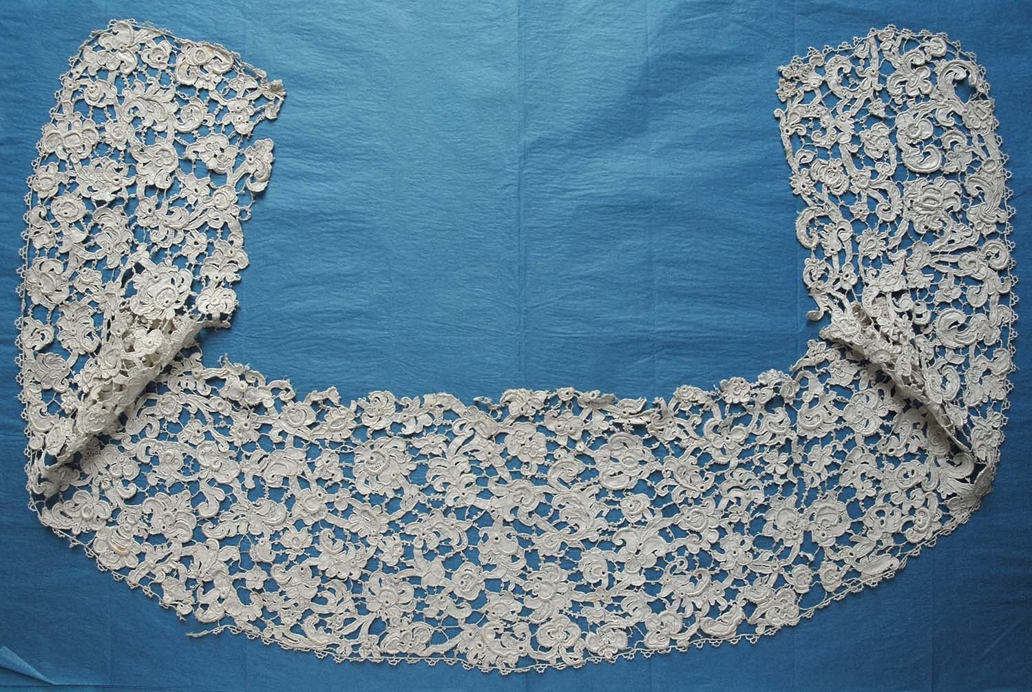 Comments: An elaborate Brussels Duchesse shawl collar with long points. Note the interesting use of needlelace, large single roses as well as the more traditional Point de Gaze grounded inserts. The roses almost match the bobbinlace in texture. Looks like someone was trying to break out of the standard Duchesse mode. Condition appears very good, seller cites some minor age spots, and I can’t find any damage in the photos.