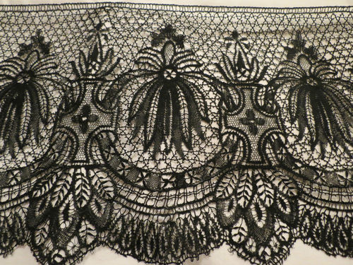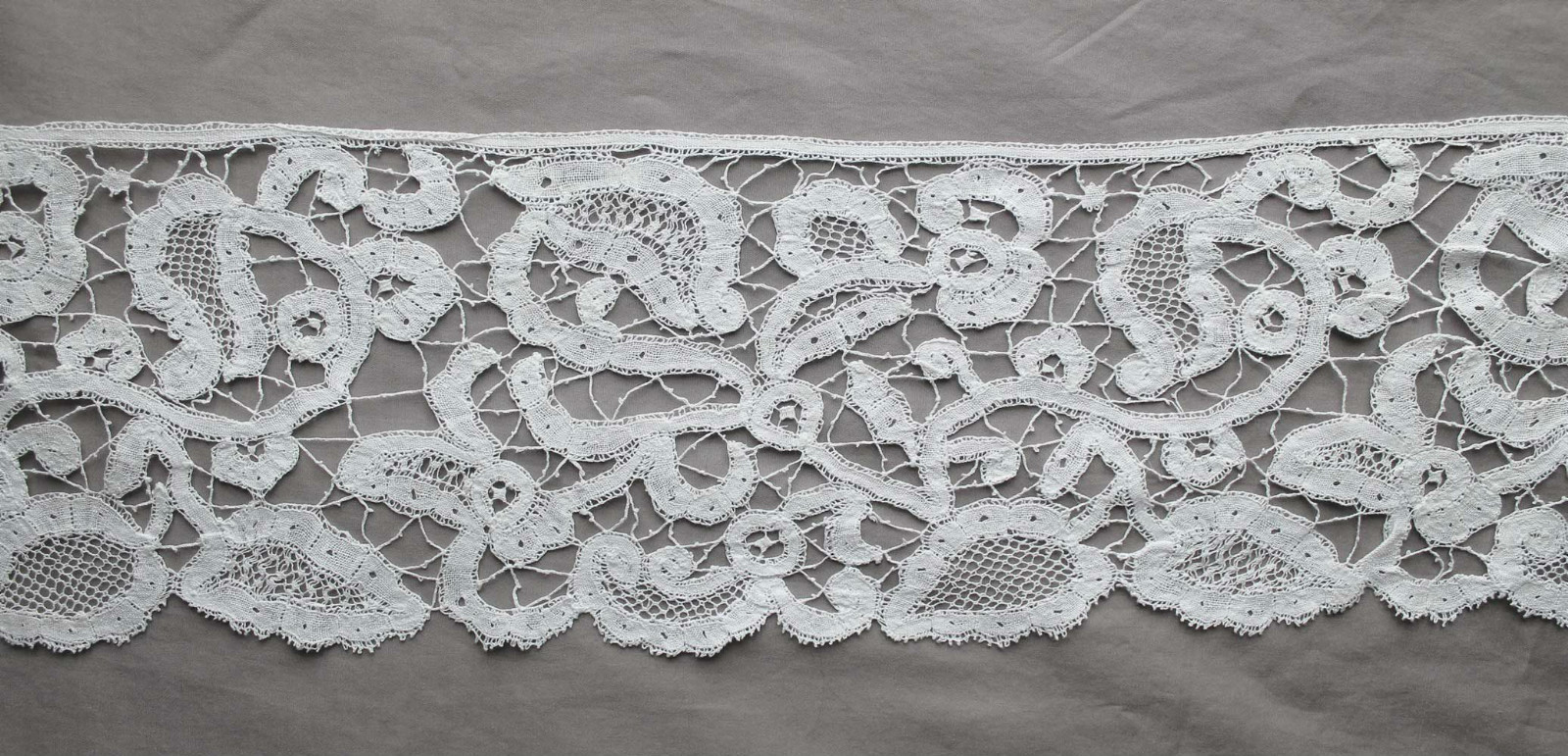 Comments: I think this border is Belgian Point de Flandre, which was kind of an upscale Bloemwerk and downscale Duchesse. Actually that’s not fair, this is a perfectly good pieced Belgian lace with characteristics of both, and it can have some impressive designs. It is really based on the early 17th century Flemish and Milanese designs. Tends to be called ‘Old Flanders’ today. This piece is nicely done with fillings and some ‘islands’ in the bride ground, which is also characteristic of Bruges Bloemwerk. Looks in very good condition from the photos.