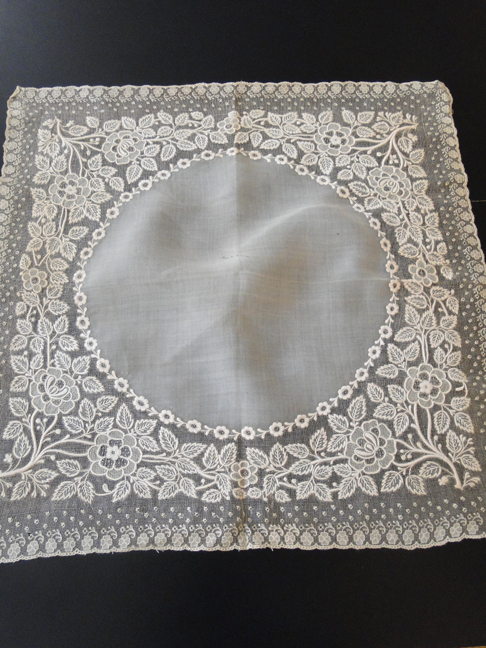 Comments: A Brussels Duchesse handkerchief. Unfortunately not all the photos are present, but it appears to be a fairly conventional design with good raised work and raised petal roses in the Point de Gaze. Can’t tell much about condition, but I do see one gap in a Pt de G insert, looks repairable.