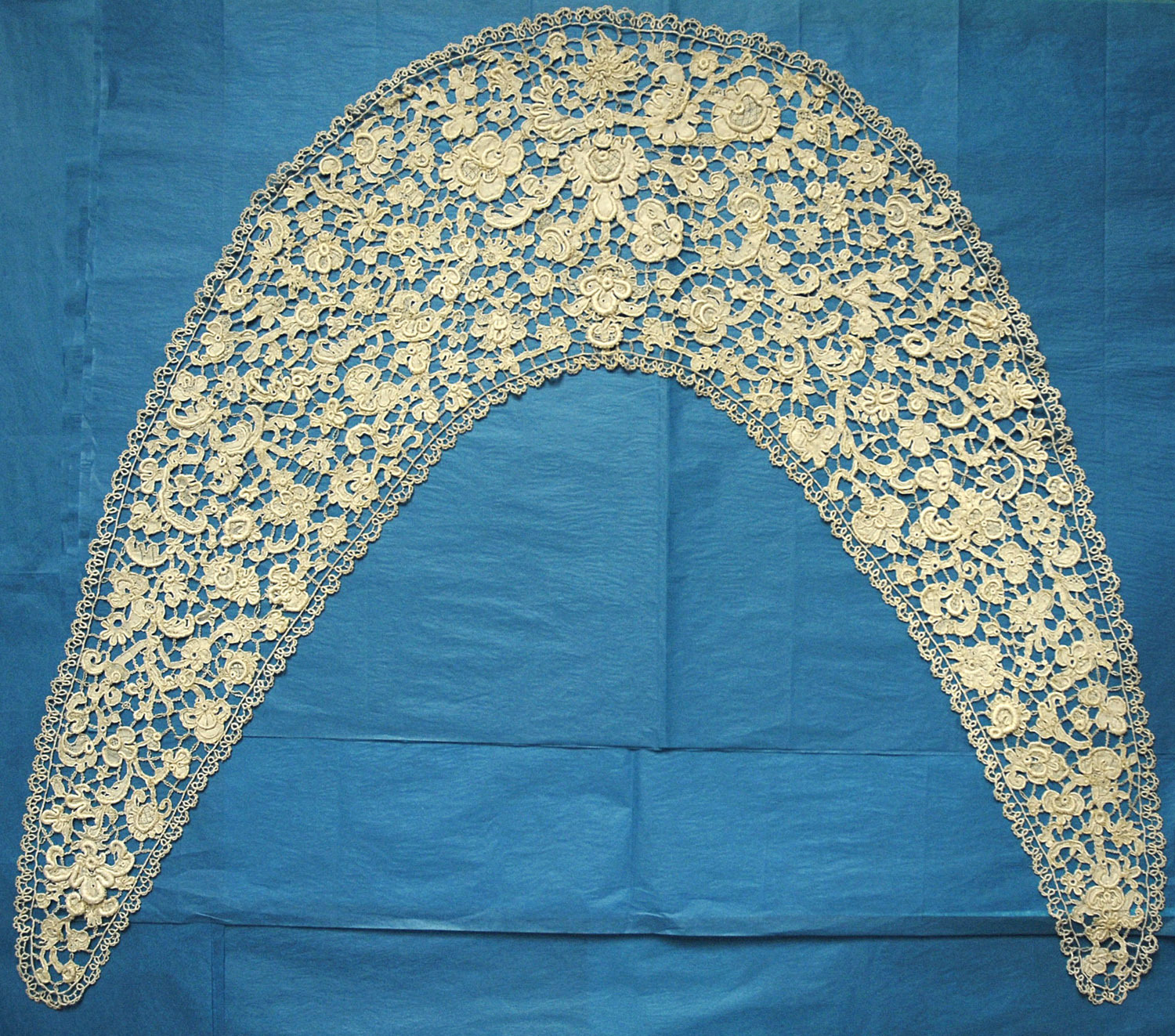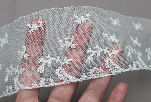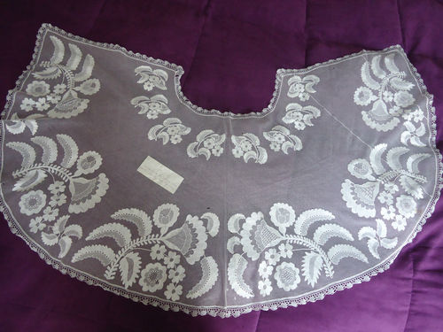 Comments: An interesting embroidered net which might be Limerick. It comes with a note indicating it was worn by a previous owner’s mother in 1830 and made by their aunt. The form of this collar is not inconsistent with designs of that period with the wide gigot sleeves and sloping neckline. The design itself seems to mirror the French blondes. There is a separate edging which is probably machine made. The condition appears very good with only slight damage to the edging. Looks like there is one seam near the right hand corner.