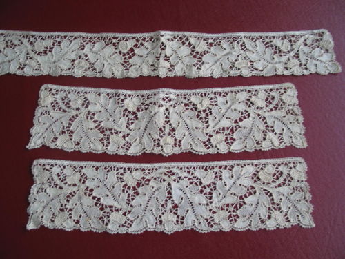 Comments: Oak leaves and acorns are certainly a British motif, but I’m not sure where this was done. Note, seller is showing a similar piece, #300854303253. It also has some similarity to German guipures. I think the two smaller pieces are cuffs, while the longer one looks cut at the ends. Basically very good condition on them all.