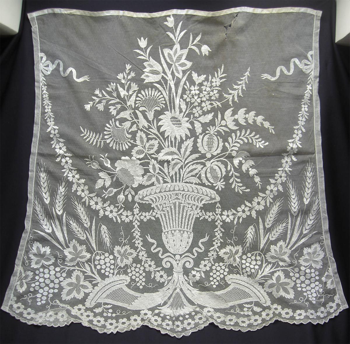 Comments: An impressive panel of embroidered net. It looks like it has been cut at the sides, but still stands very well on its own. It’s a needlerun lace with nicely done fillings. A few small holes at the top, overall good condition.