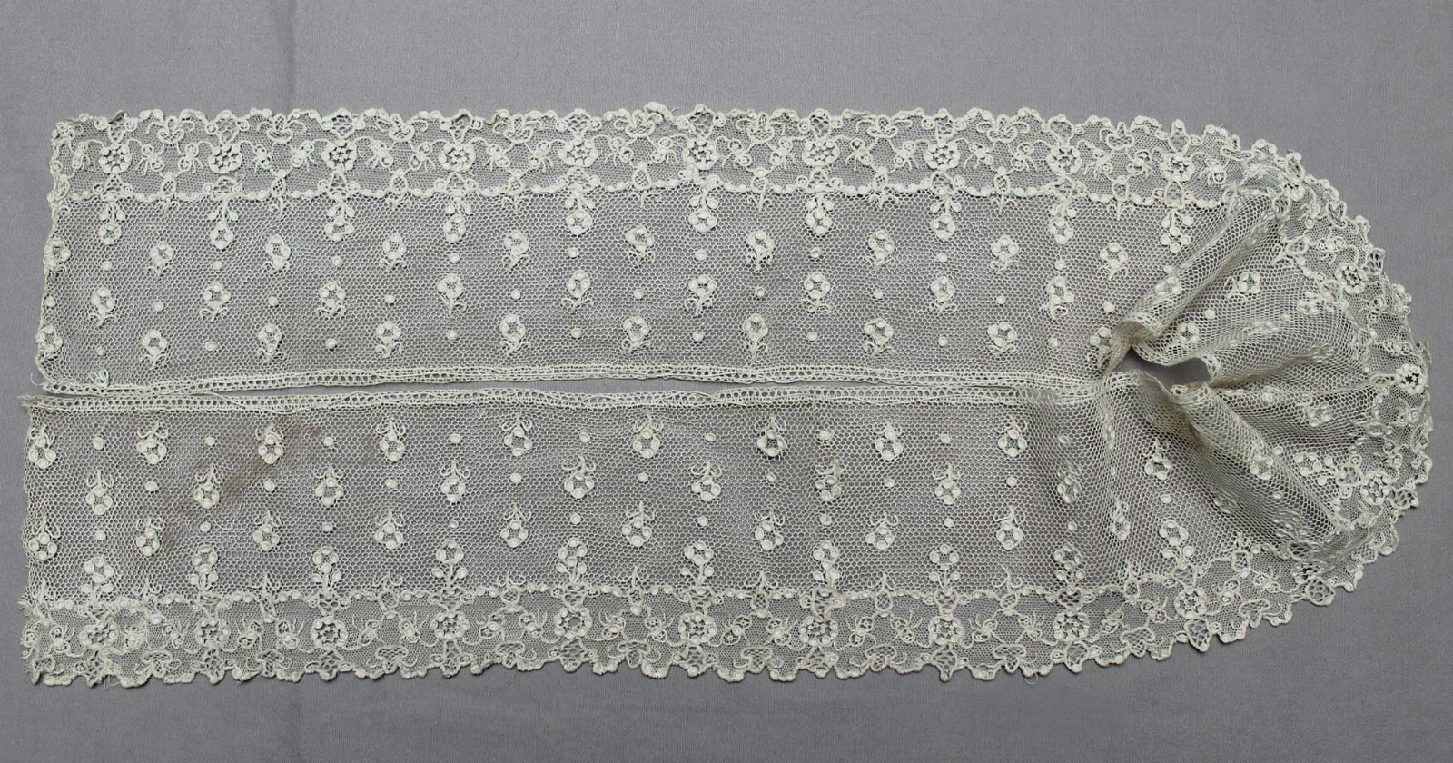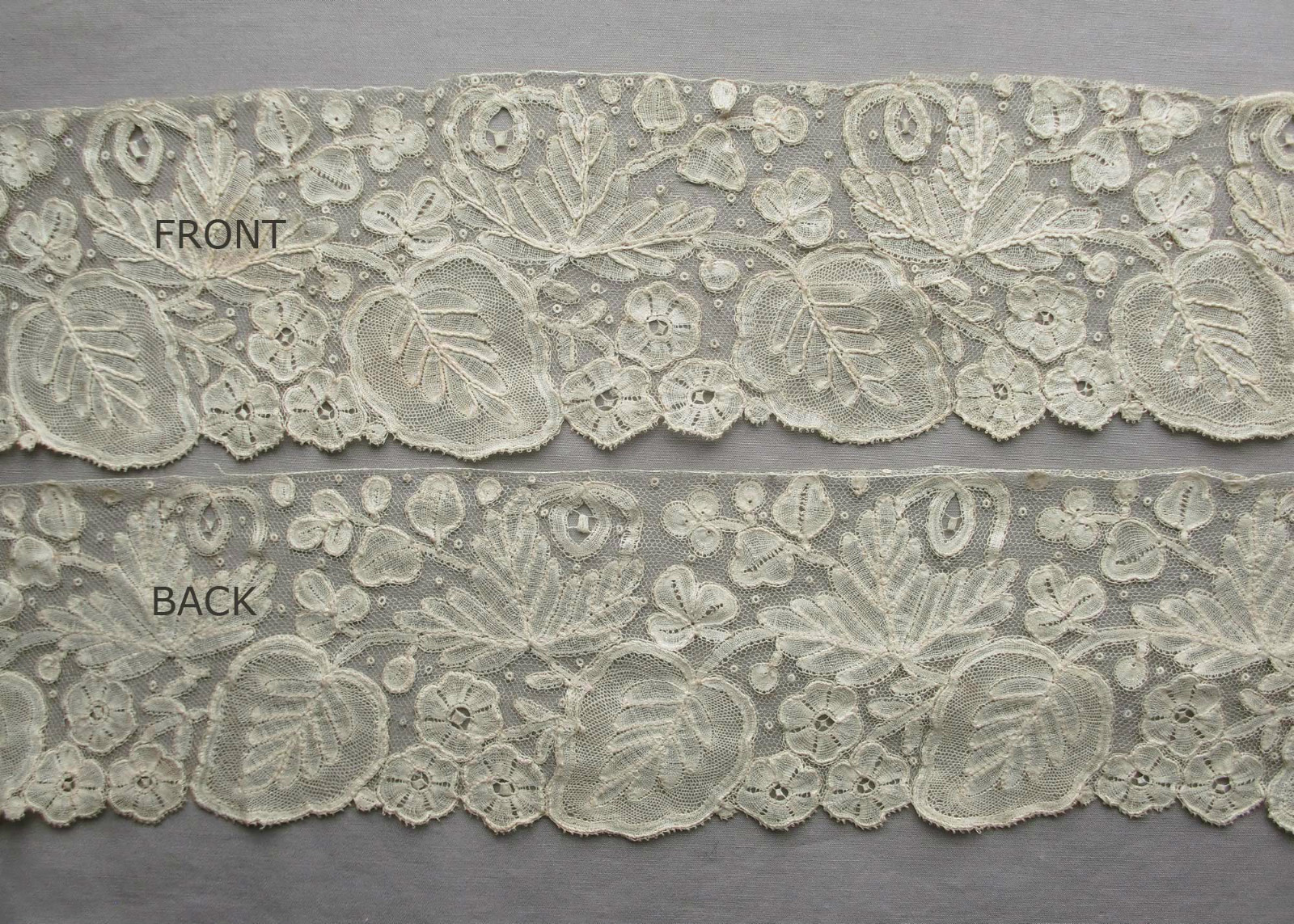 Comments: Two lengths of 19th c Point d’Angleterre, meaning well-done bobbinlace with a Point de Gaze needlelace ground. This one has quite a delicate appearance, although the motifs are a little larger than usual, and there are no fancy fillings. Note the little rings used as esprits in the ground. Seller cites some staining and a few tiny holes, basically good condition.