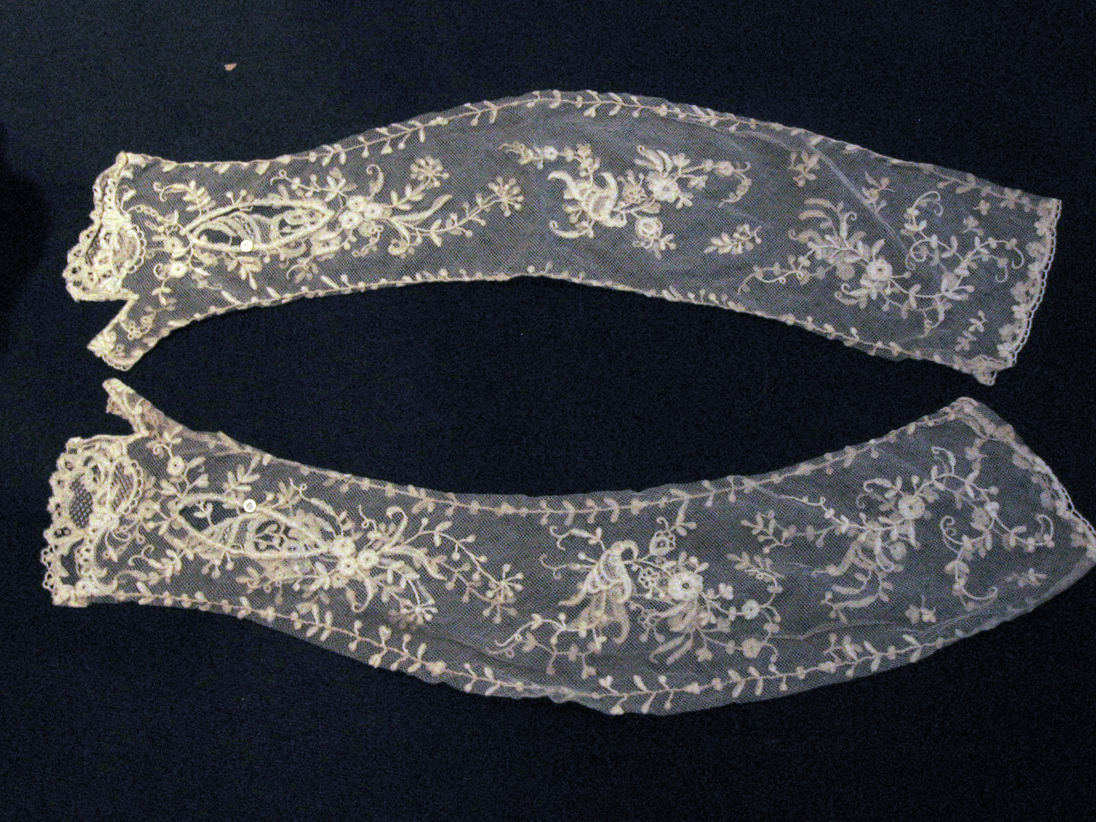 Comments: A very unusual pair of long ‘gloves’ of Brussels bobbinlace application on machine net. They look original, and in very good condition. Note the little slit with the button to help in dressing. Thumb only, the other fingers are left free. I’ve never seen anything like this before, pretty amazing.