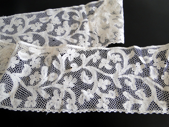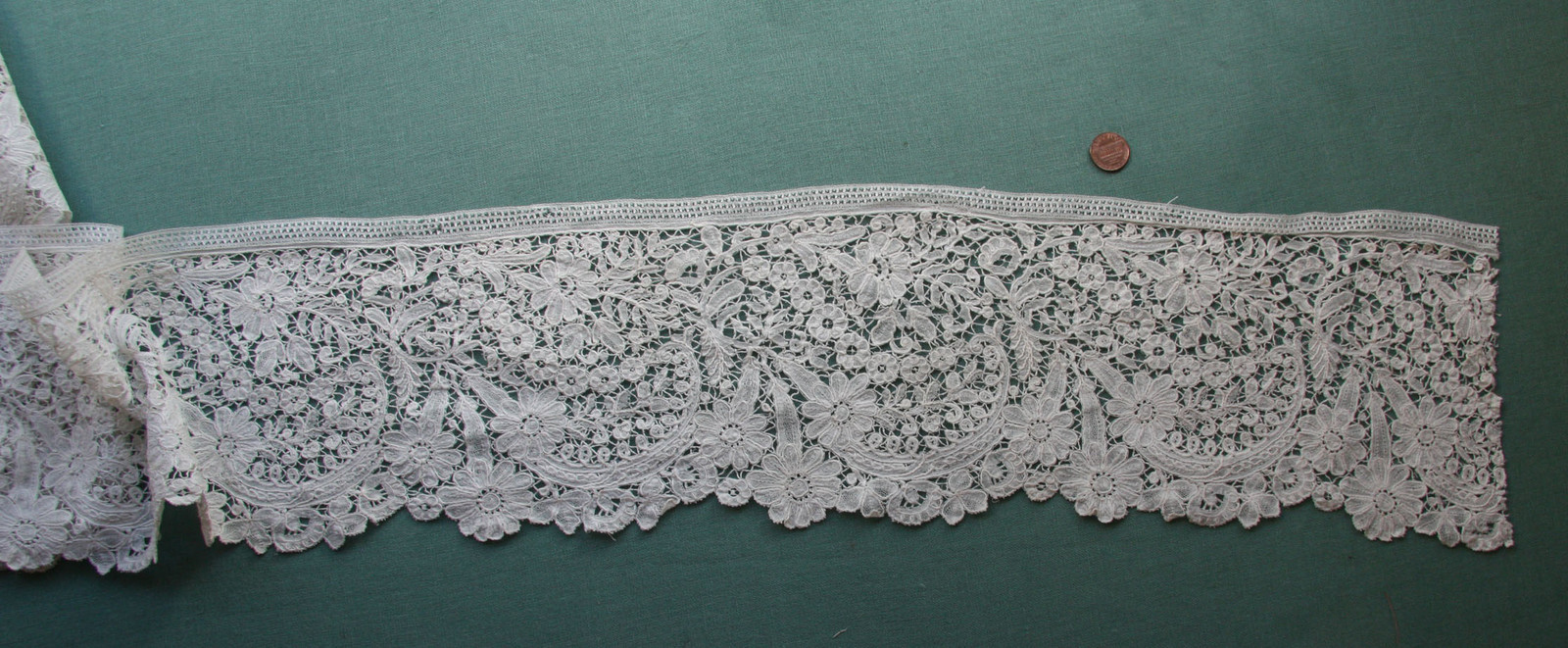 Comments: A Duchesse border, reasonable width and very nice length. No Point de Gaze inserts, and a few simple needlelace fillings in flower centers. This has a conventional pattern, nicely worked. Seller cites a few breaks, minor, basically very good condition.