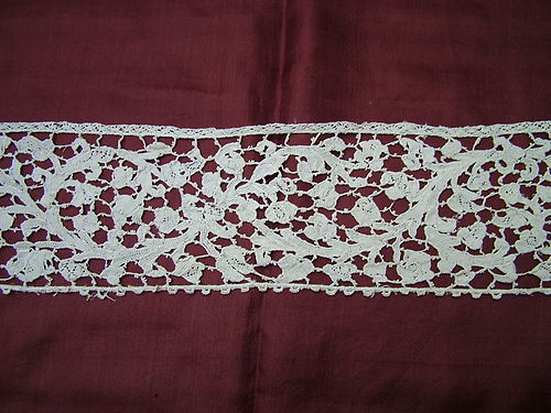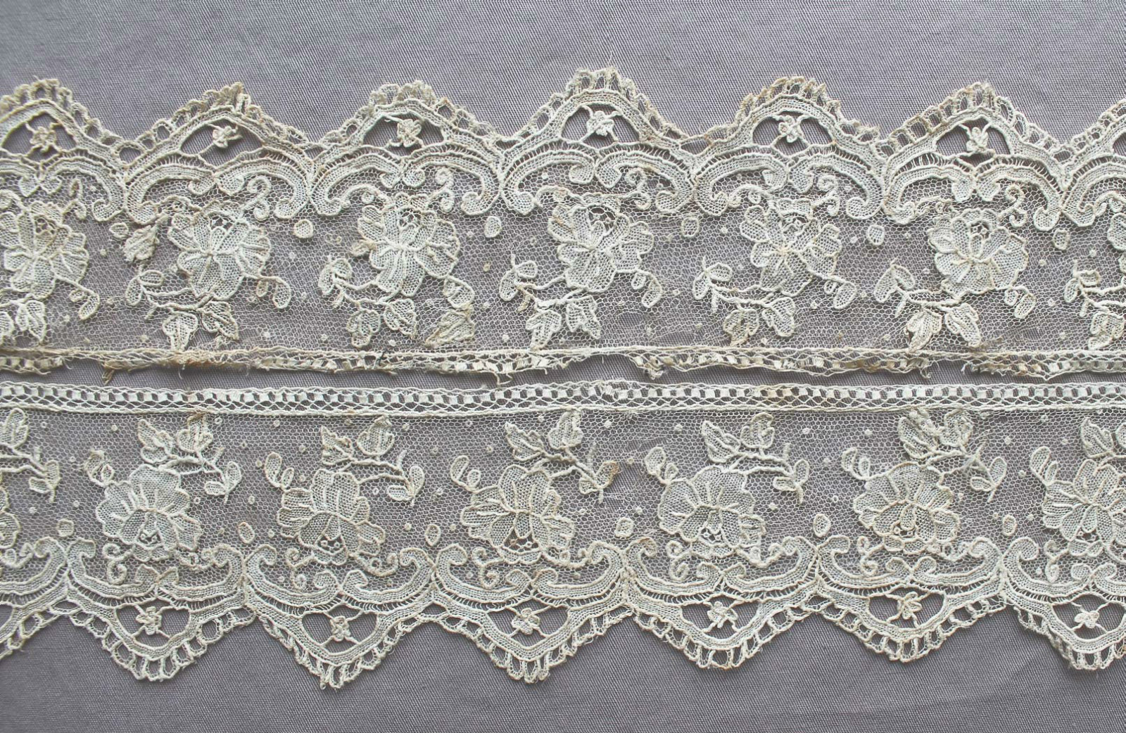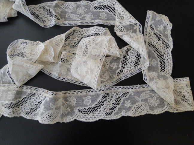 Comments: I like this narrow Point de Gaze edging because of the treatment of the lower edge. Rarely you see Point de Gaze where they dispense with the ground altogether, and make what almost looks like a guipure. You see hints of that here. There are a few holes and stains, especially in two areas. Basically good for the most part.